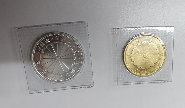 昭和61年に発行された「天皇在位60周年記念」の10万円金貨と1万円銀貨です。