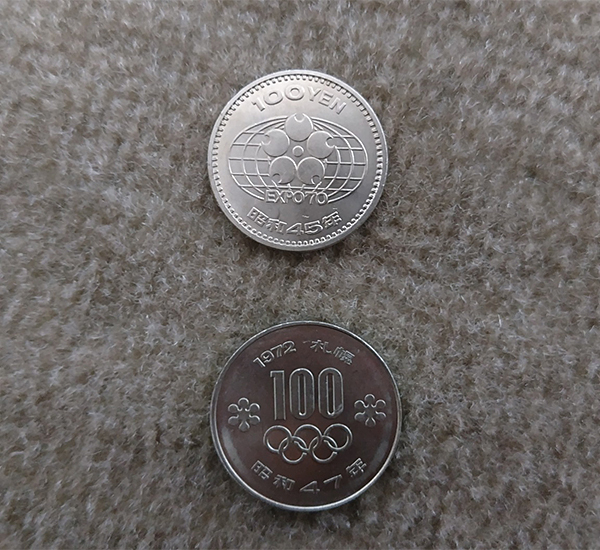 昭和40年代は前の大阪万博と札幌オリンピックの100円硬貨。